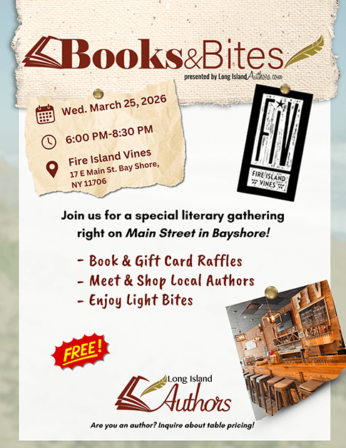 Long Island Authors is throwing a Books & Bites night at Fire Island Vines (Bay Shore, NY) where the main course is great stories and great people. Meet local authors, talk shop, discover new reads, grab signed copies, and swap recommendations with fellow book lovers—while enjoying plenty of bites in a fun, welcoming space.